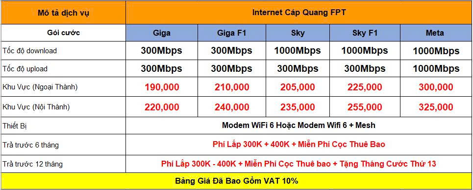 Bảng Giá Cước Internet FPT, Cáp Quang FPT