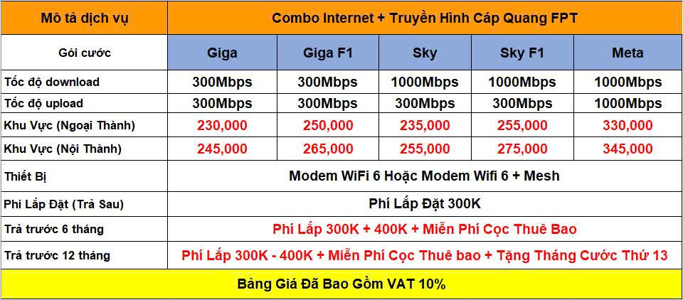 Có chương trình nâng cấp lên Combo Internet + Truyền hình FPT, ưu đãi thay đổi theo từng thời điểm.